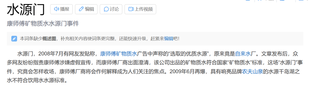 幸災樂禍的農夫山泉立刻轉發宣揚這篇報道,擴大負面影響,網絡成了品牌們的新“戰場”,互相攻擊、自證清白、製造輿論、煽風點火……時至今日,“水源門”已經成了一個專門的詞條被記錄在百科裏。
