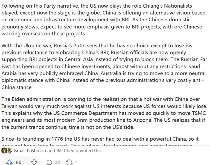 我看到的所有跡象表明,中國人民將有一個非常艱難和具有挑戰性的2023年。美國將中國視為21世紀對美國領導地位的第一個嚴重挑戰。為此,中國人必須願意在中國經濟向更現代的高科技經濟轉型時,做出增長速度放緩、失業率上升和疫情的犧牲,這將使中國在許多領域超越美國,進入領導地位。