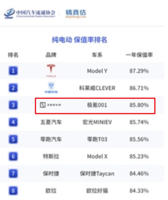而根據中國汽車流通協會的報告,極氪 001 的一年保值率能達到 85.8% 。
