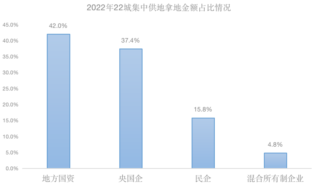 據統計2022年22城集中供地中,地方國資成為拿地主力,拿地金額佔比達到42.0%,超過了央、國企的37.4%,而民企僅為15.8%