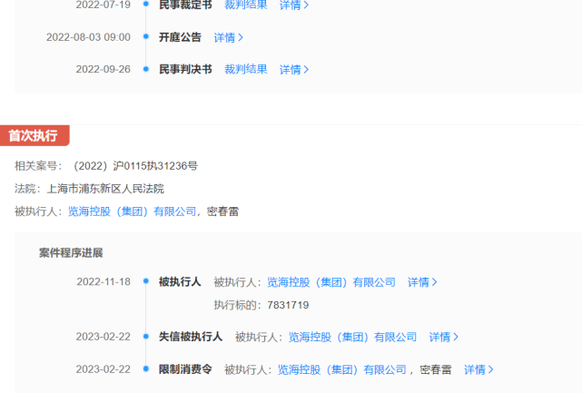 天眼查資料顯示,覽海控股有3條被執行人信息,4條歷史被執行人信息,被執行總金額達9.33億元。立案日期距今最遠的為2022年6月,執行標的約7.19億元;日期最近的為2023年1月5日,執行標的2.06億元。