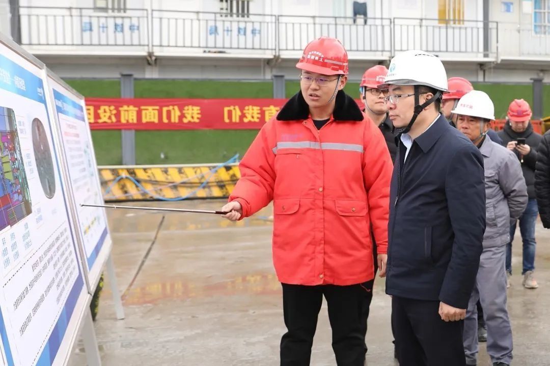 楊蔚一行首先來到7號線小洋江站,詳細瞭解節點計劃、安全質量管控、文明施工等情況。隨後來到8號線一期明州醫院站,查看明州醫院站-廟堰站類矩形盾構掘進情況,隧道區間將於2月底實現貫通。最後來到6號線一期經三路站,該站正在進行地連牆施工,楊蔚聽取了現場施工進展、安全生產、存在難點卡點等情況彙報。