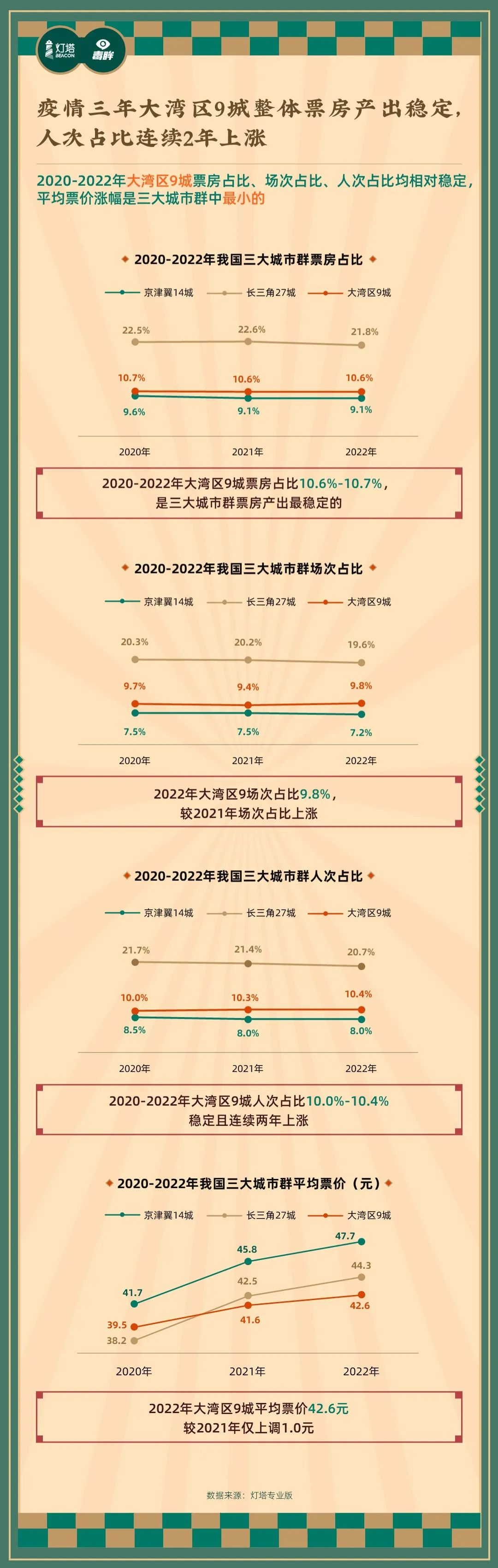 而廣東省作為國內最大的票倉所在,已經連續21年穩坐全國省份票房榜冠軍,是粵港澳地區的“電影重鎮”。燈塔數據顯示,2022年廣東省總票房37.9億,佔中國電影市場總票房的12.7%,廣東省內進入粵港澳大灣區的9個城市又貢獻了廣東總票房的8成以上。
