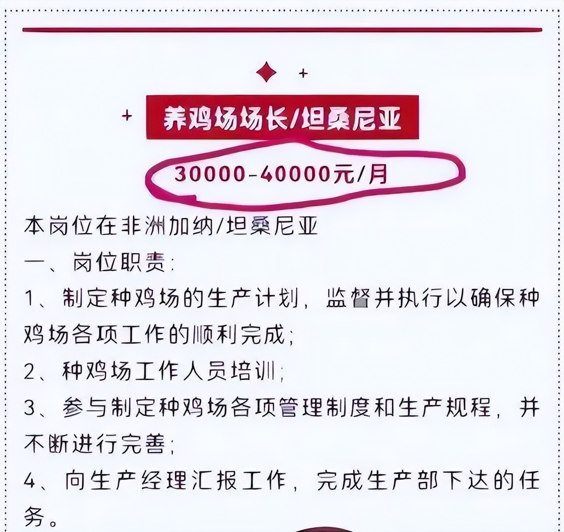 2月23日,山東青島一企業稱月薪3-4萬招聘養雞場場長,工作地點在坦桑尼亞。