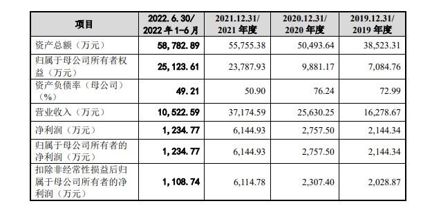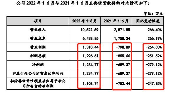 招股書第236頁顯示,2022年1-6月營業收入10522.59萬元,同比增長266.40%,營業成本6438.85萬元,同比增長266.19%;然而,2021年1-6月營業利潤、利潤總額、淨利潤、歸母淨利潤、扣非歸母淨利潤分別為-798.89萬元、-855.66萬元、-689.37萬元、-689.37萬元、-752.44萬元,而2022年1-6月的上述對應數據分別為1310.44萬元、1296.51萬元、1234.77萬元、1234.77萬元、1108.74萬元。