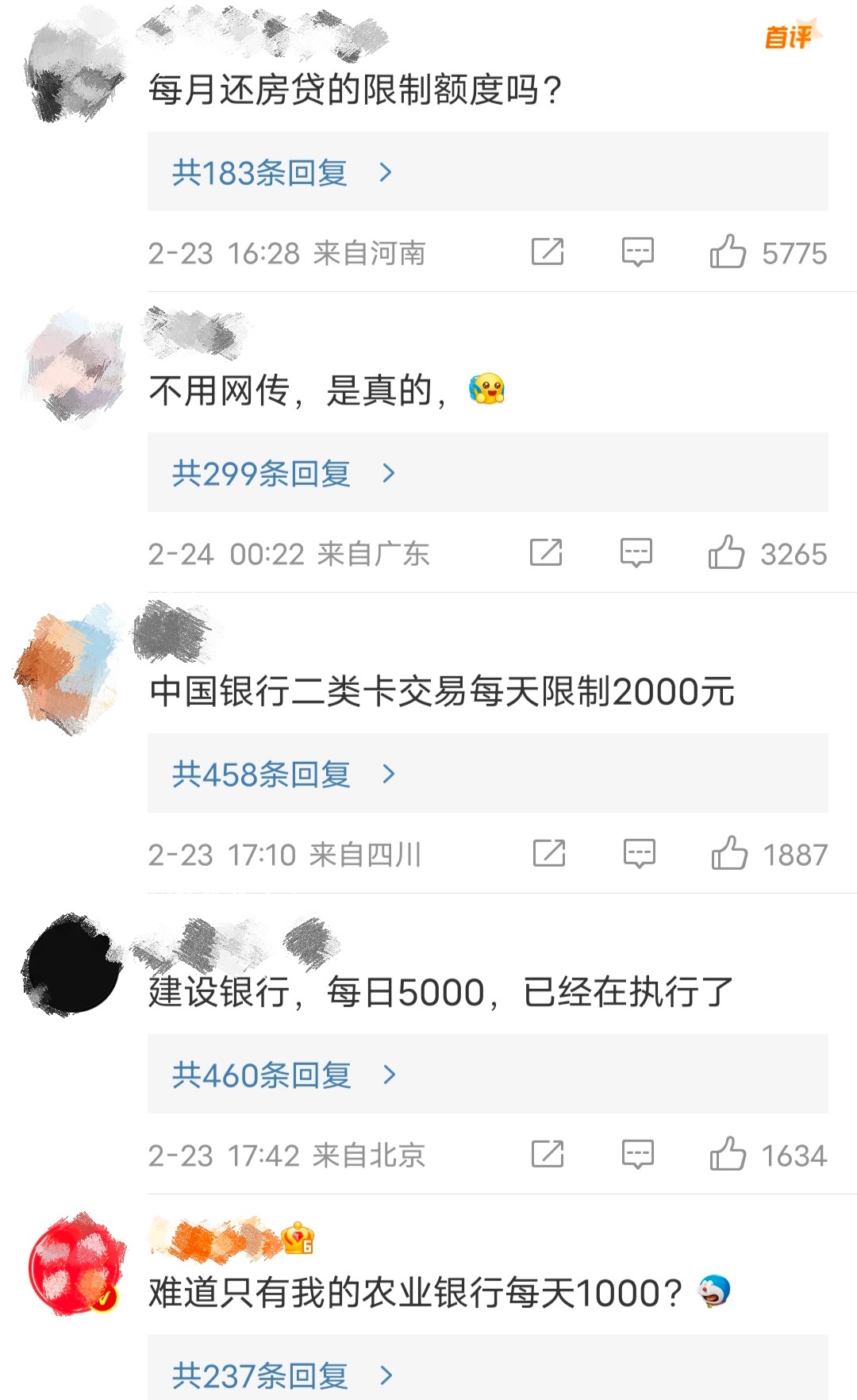 對此,網友議論紛紛,“每月還房貸的限制額度嗎?”“不用網傳,是真的”“難道只有我的農業銀行每天1000?”……