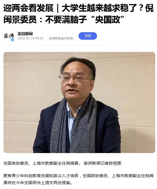 2月23日下午,全國政協委員、上海市教委副主任倪閩景在接受媒體集中採訪時,講述了提案內容,並就就業、考公等熱門話題分享了觀點。