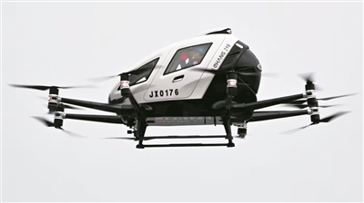 這輛“飛行汽車”可搭載兩名乘客,試飛使用的是中國製造的基於無人機技術的雙座“飛行汽車”。