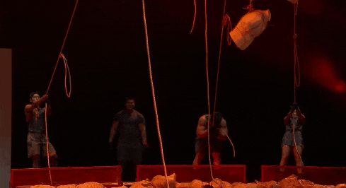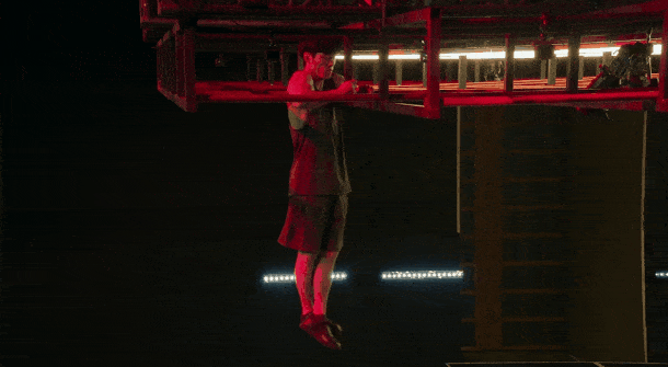 下令後,一張巨大的鋼筋網從天而降,選手們雙手吊在上面,地板則裂開大縫,煙霧繚繞,深不見底。