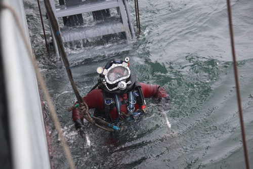 ▲我國海軍潛水員在工作船支持下進行120米深度的氦氧混合氣體潛水