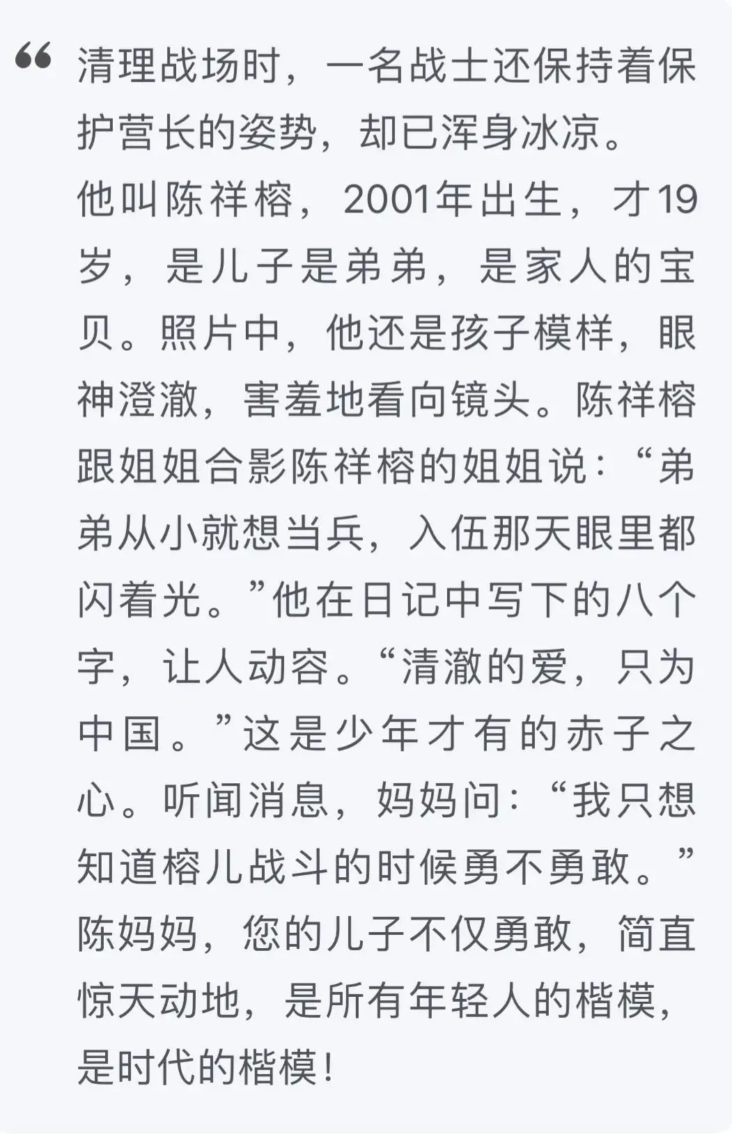 曾經有個年輕人也喊出類似的口號,他在自己的日記寫下:“清澈的愛,只為中國”,這也是豪言壯語嗎?這也是表面文章嗎?如果他沒有犧牲,那些噴子肯定會説那只是為了標榜自己,但是我們看到了,他用自己的生命詮釋了他的豪言壯語:清澈的愛,只為中國!