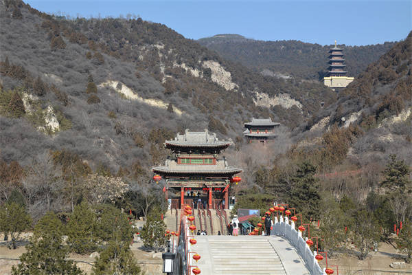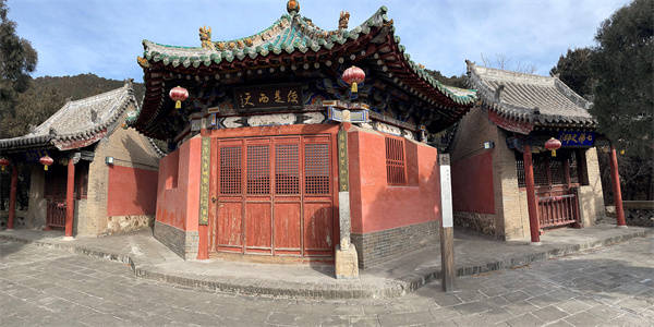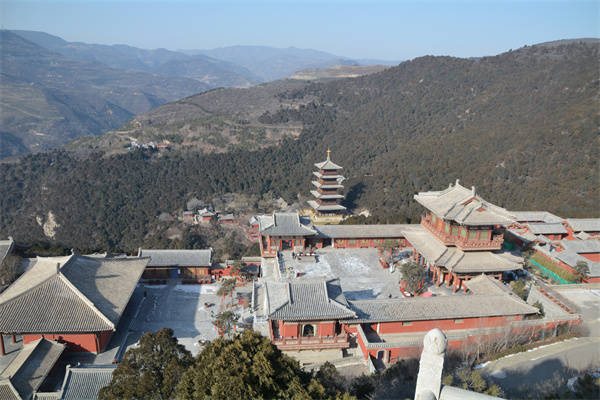 松柏掩映之中,隱現着由牌樓、山門、戲台、中門、鐘鼓樓、三大士殿、佛祖閣、廂房、禪房、觀音堂、文殊殿、普賢殿構成的宏大寺院羣。