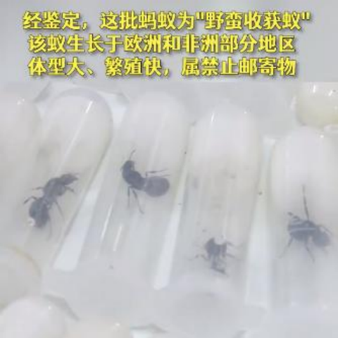 再比如,南京金陵海關在檢查進境國際郵件時,發現一包裹藏有378只大號螞蟻,收件人是一位異寵愛好者。經鑑定,該蟻為“野蠻收穫蟻”,屬禁止郵寄物,生長於歐洲、非洲部分地區,體型大、繁殖快、捕食積極且好戰,若逸散野外將破壞本地農林生態、爭奪本地螞蟻生存資源。