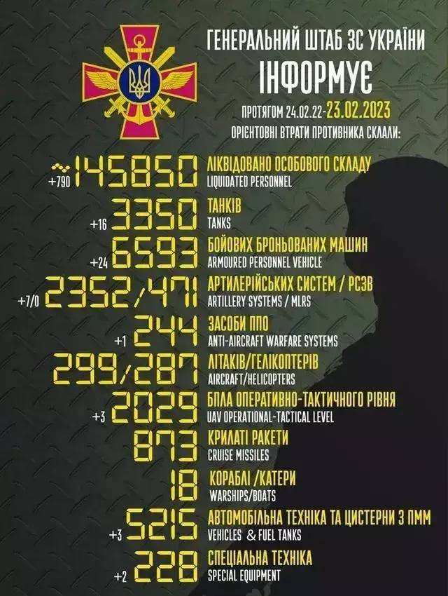在戰爭一週年之際,烏克蘭發佈最新數據,截至2023年2月21日,俄軍在烏克蘭戰場上被“清算”的人數已達到145850人。