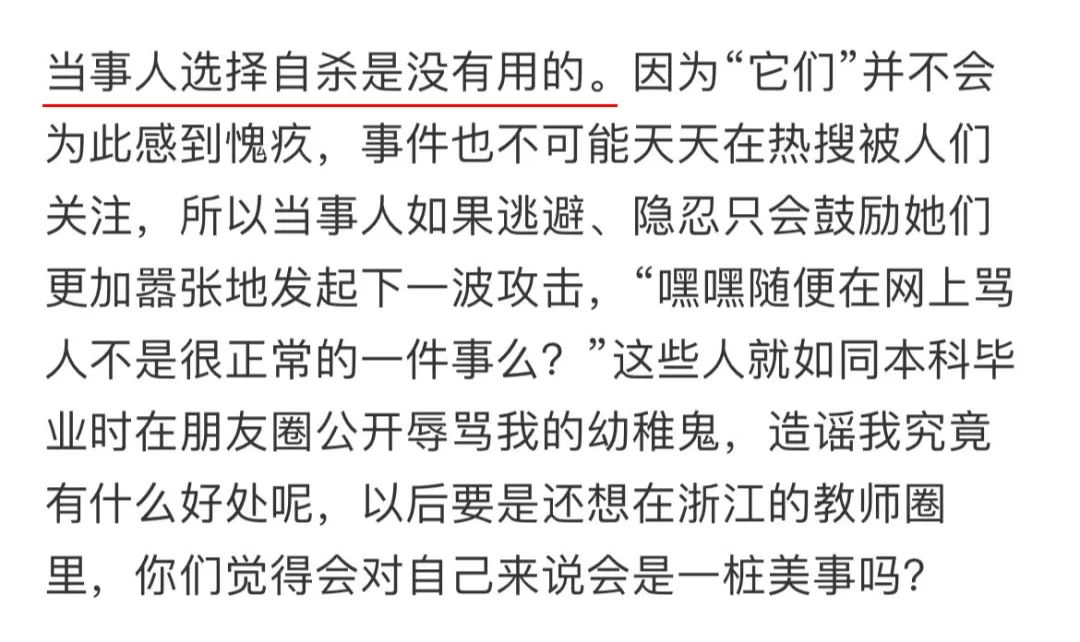而要知道,在另一篇帖子裏,她還曾告誡與自己有相似遭遇的人,任何形式的逃避(包括自殺),都無法拯救網暴者的良知。