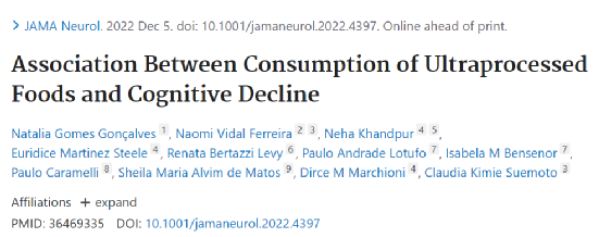 [1] Gomes Gonçalves N, Vidal Ferreira N, Khandpur N, Martinez Steele E, Bertazzi Levy R, Andrade Lotufo P, Bensenor IM, Caramelli P, Alvim de Matos SM, Marchioni DM, Suemoto CK. Association Between Consumption of Ultraprocessed Foods and Cognitive Decline. JAMA Neurol. 2022 Dec 5. doi: 10.1001/jamaneurol.2022.4397. Epub ahead of print. PMID: 36469335.