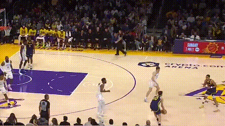 又比如,這次擋拆後的急停前傾拋投,突出了一個“前怕狼,後怕虎”。他顯然對班巴的尺寸有所忌憚,又對湖人這兩場從身後的撲防印象深刻,於是做出了這樣的高難選擇。時間上,給盧尼仍然來得及,班巴不見得擋得住盧尼順下的對抗。另外,這兩場湖人從身後撲防的力度都很大,以普爾的造犯規技術,他本可以利用一下。