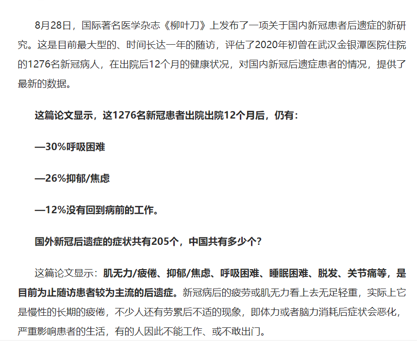 但是這也確實説明了一些問題。新冠很多後遺症,比如説疲勞之類的,是主要以體感為主的,這不像是某些可以直接測定的研究那麼準確,這會對於研究造成一點難度。確實有些研究試圖尋找更加量化的指標,比如説血液中什麼物質的濃度之類的,但是目前來看,這些指標都缺乏普適性。