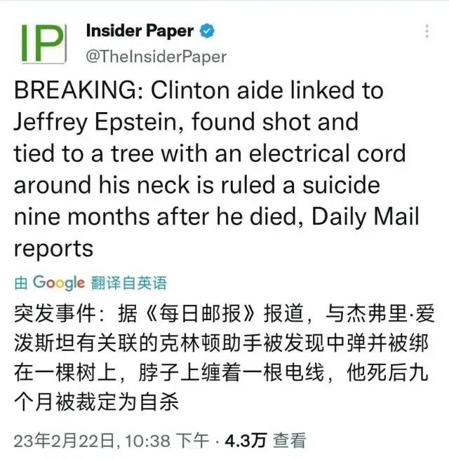 2月22日,阿肯色州佩裏縣發佈了一份報告,揭露了克林頓的前高級顧問馬克·米德爾頓離奇“自殺”的更多細節。報告稱,事發當天,米德爾頓從家中出發,到了30英里外一個從未去過的農場,隨後在樹上上吊,並用獵槍射中自己的胸口。