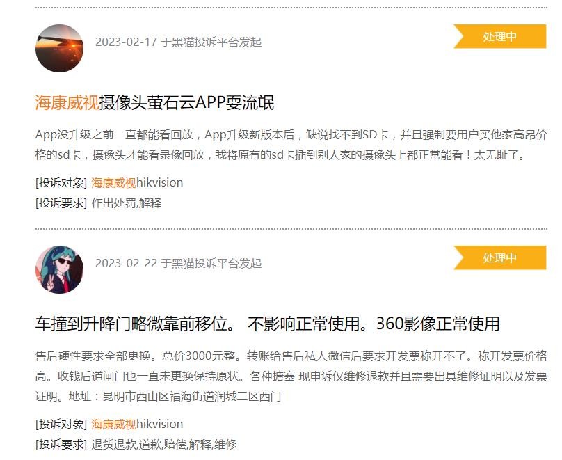 目前這些投訴均顯示在處理中,尚未見有處理完畢的,產品是企業最好的名片,也希望海康威視能真正重視起來,包括但不限於努力提升售後服務體驗,提升產品質栓標準等,只有產品質量過硬,用户才不會源源不斷流失!