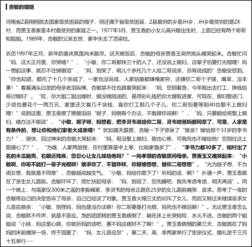 而女性則淪為男人之間獲得婚姻的交換工具,這是對無法掌握自己婚姻主權的廣大底層女性的赤裸裸的剝削。