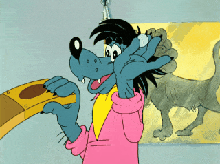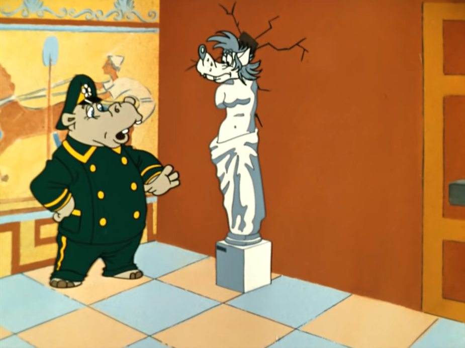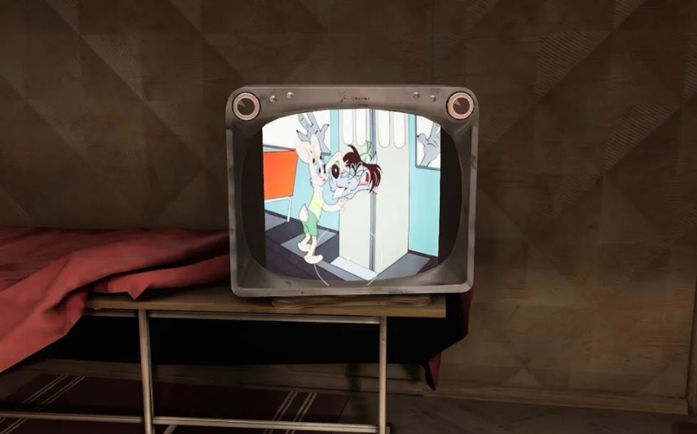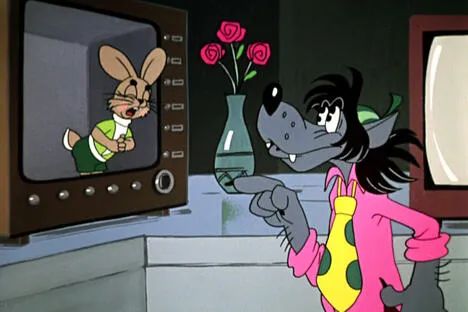 而電視裏播放的內容,是1969年首播的蘇聯動畫短片:《兔子等着瞧》(Ну, погоди!)。