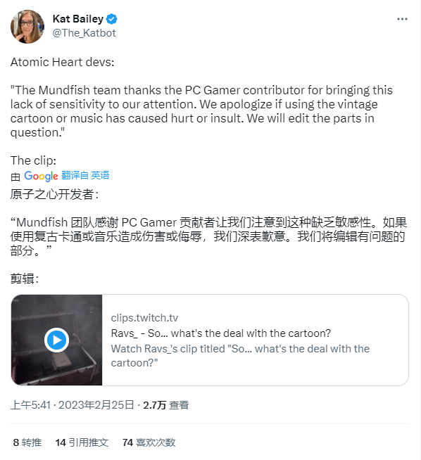 “Mundfish開發團隊感謝PCGamer內容貢獻者讓我們注意到這種缺乏敏感性的問題。如果使用復古風格的動畫片或音樂造成了傷害或侮辱,我們深表歉意。我們將編輯有問題的那部分內容。”