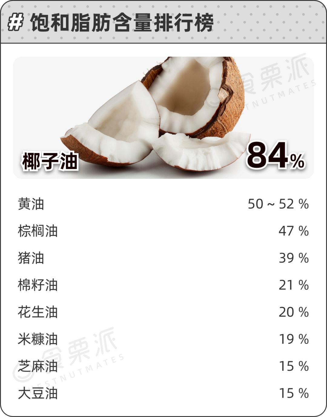 動物油飽和脂肪含量高,植物油飽和脂肪含量低。熱帶植物油是例外——椰子油是飽和脂肪含量最高的油了。