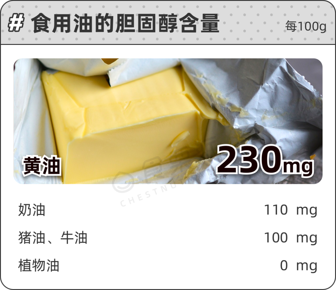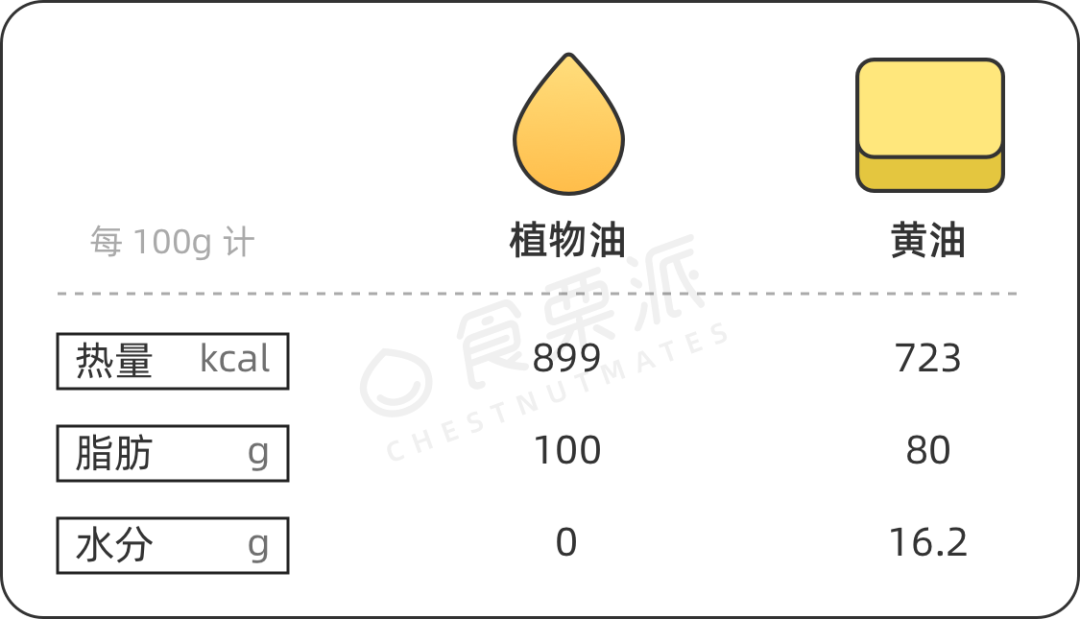 黃油、自己家熬的豬油裏,都還有一些水分,脂肪含量比植物油低一些,在80%左右,所以熱量也低一些。
