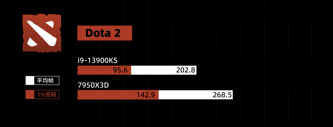 在 Dota 2 中,同一場 Knights 的錄像,7950X3D 無論是平均幀還是低幀,都遠遠超過 13900KS。