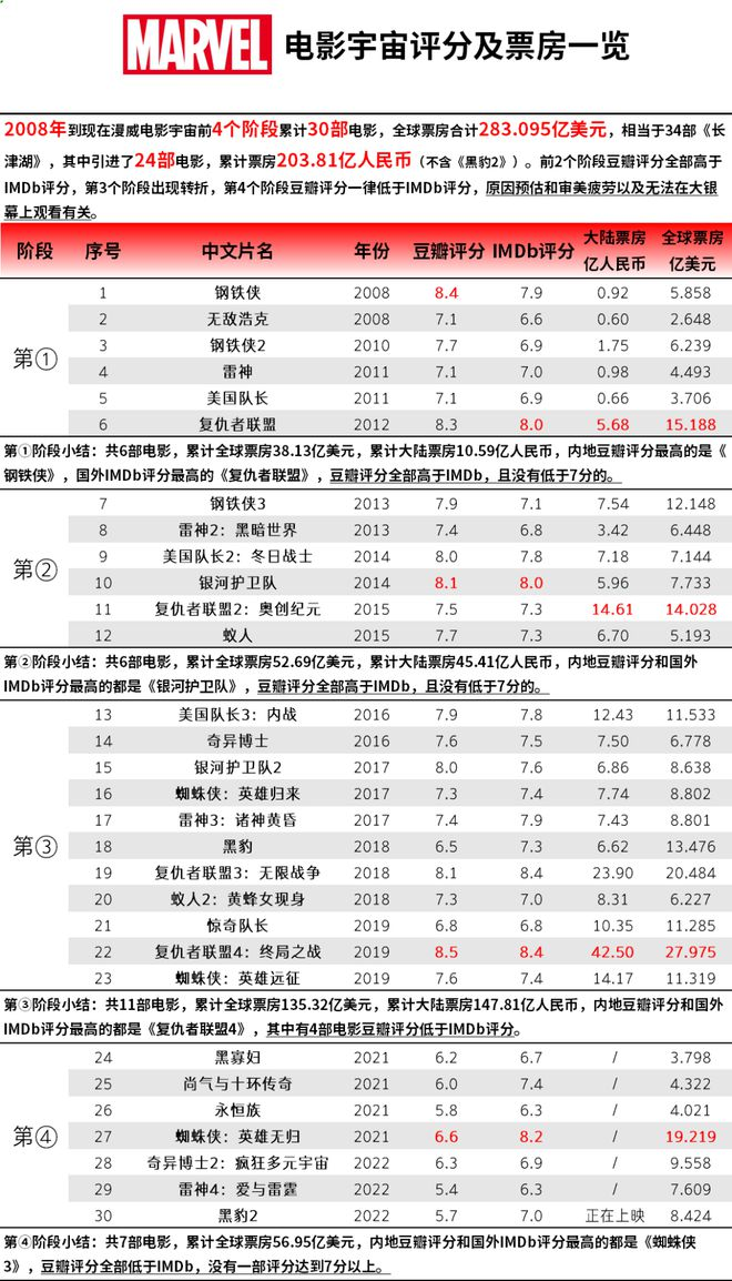 漫威失靈,原因是複雜多方面的,既有其**第四階段自身質量下降的因素,同時也與過去三年半,漫威闊別中國導致粉絲流失、中國影迷觀影熱情下降有關。**不難看出,整個第四階段豆瓣評分、IMDB評分均有下滑,前者下滑更嚴重,三部不及格,唯一可圈可點的是19億美元+的《蜘蛛俠:英雄無歸》。