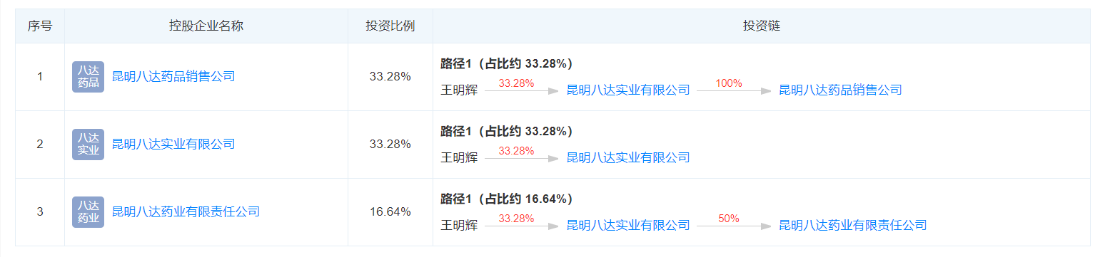 王明輝持有股份的公司有3家,為昆明八達實業有限公司及其子公司。其中,昆明八達藥業有限責任公司於2001年4月被註銷,昆明八達藥品銷售公司於2003年7月10日被註銷,昆明八達實業有限公司於2015年4月被註銷。