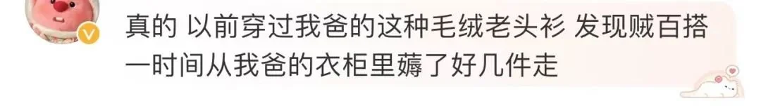 網友:昨天在家看着我爸穿在襯衫外面的一件灰色老頭針織背心也一陣恍惚……這不是……我一直想買來搭襯衫的那種背心小馬甲嗎……