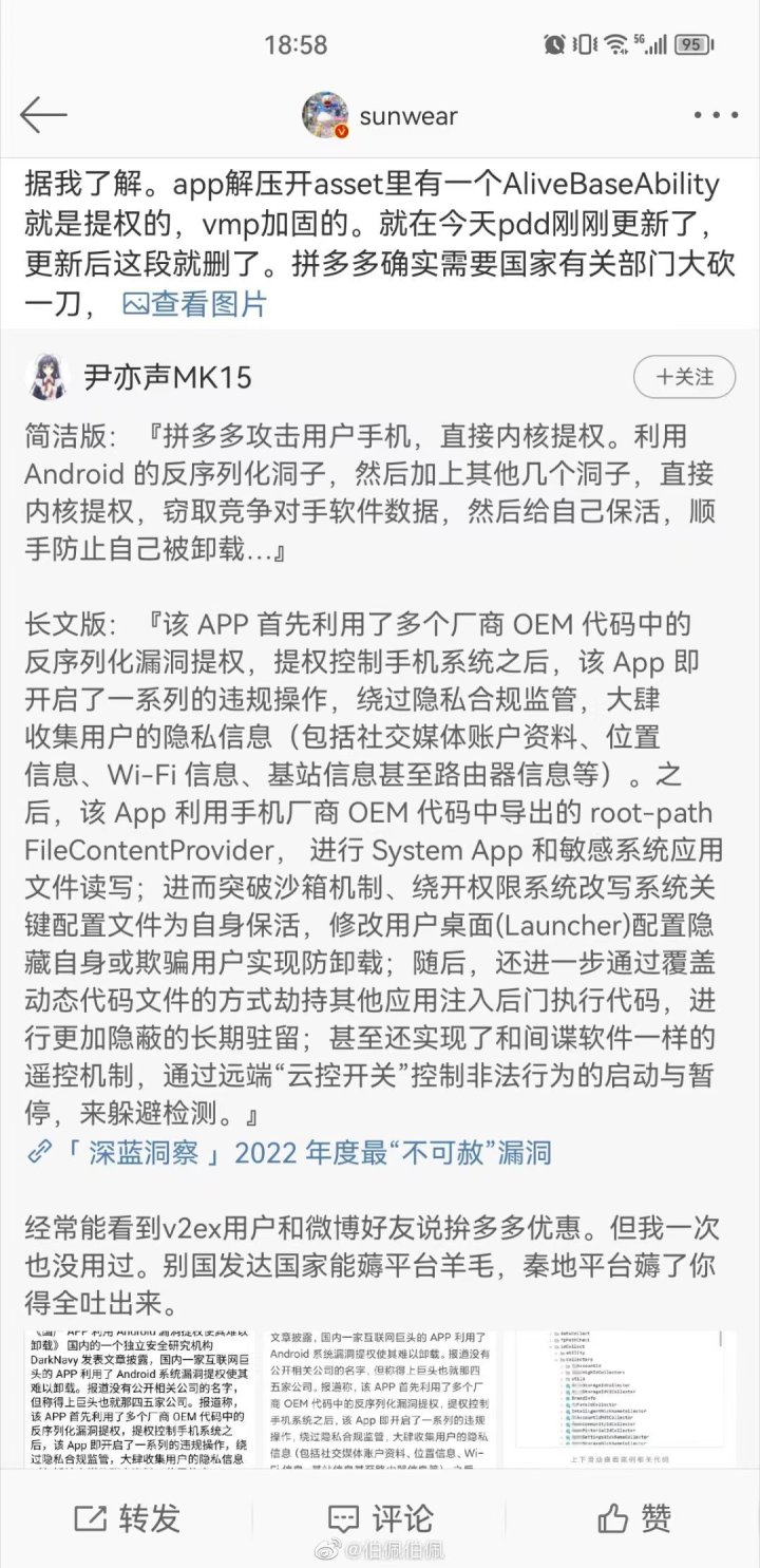 前幾天發生的事情,被安全界大佬發現,拼多多利用漏洞提權,完全控制用户手機。收集用户隱私,收集用户其他APP信息,手機友商信息。