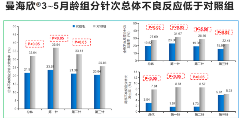 3~5月齡,對照為AC結合疫苗,總體不良反應發生率為曼海欣21.9% Vs 對照32.0%(P<0.05,曼海欣優於對照疫苗);