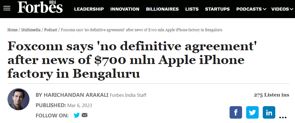 起因是,上週,富士康董事長劉揚偉專門去了印度,會見了印度經濟領域一批高管。