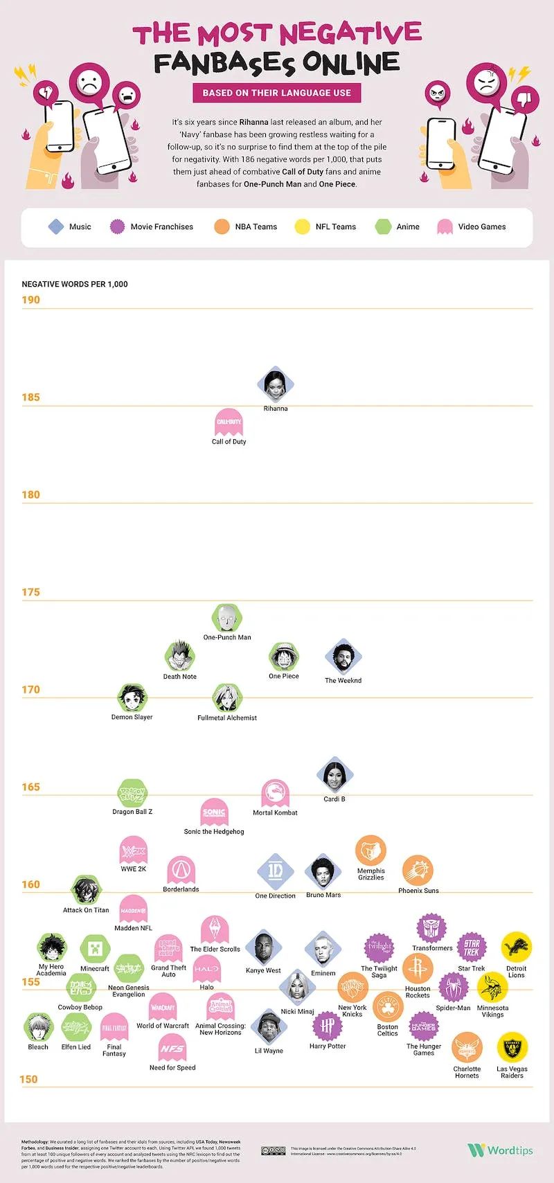 2021年12月,Mirela Iancu在 “NBA” “音樂”“動畫”“遊戲”等不同領域中挑選了186 個粉絲社羣,在每個社羣至少100位粉絲的推特中各抓取了1,000 條推文,使用 NRC 詞典分析統計了其中常見的正面詞彙和負面詞彙數量。