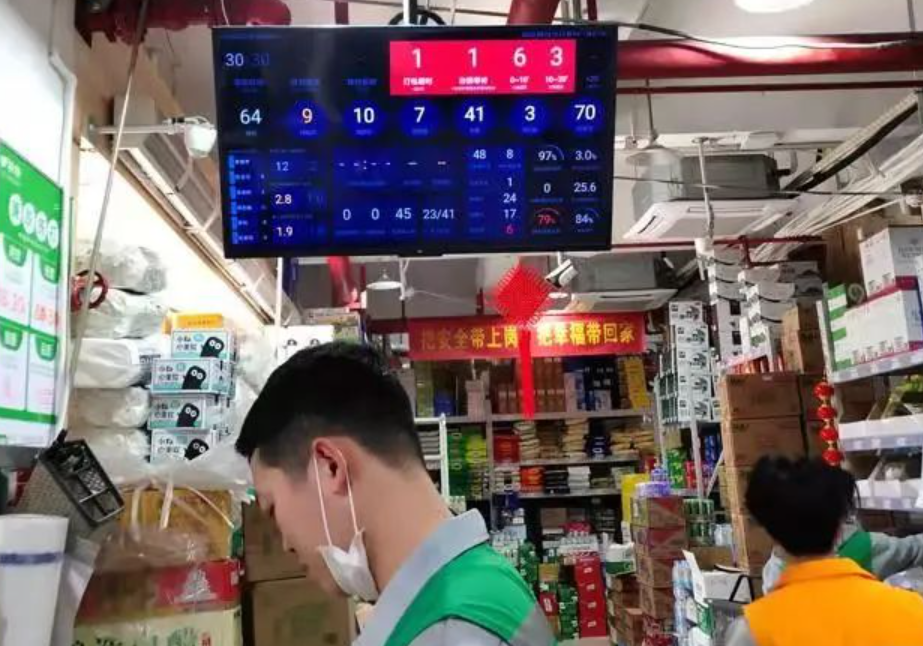 另外,為了保證效率,樸樸每個前置倉內都配備了一塊電視屏,實時顯示前置倉分揀打包的大數據:枱面等待x單、打包超時x單、訂單超時x單……