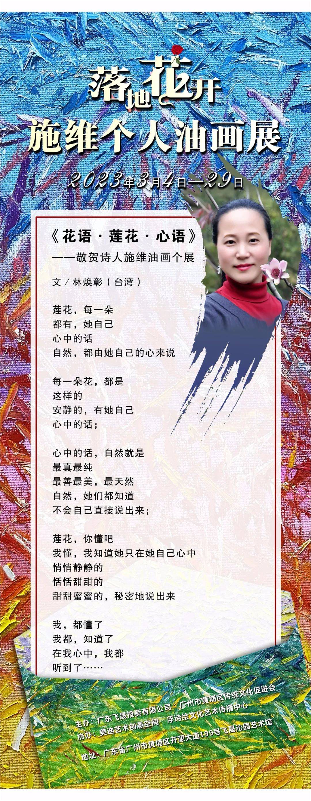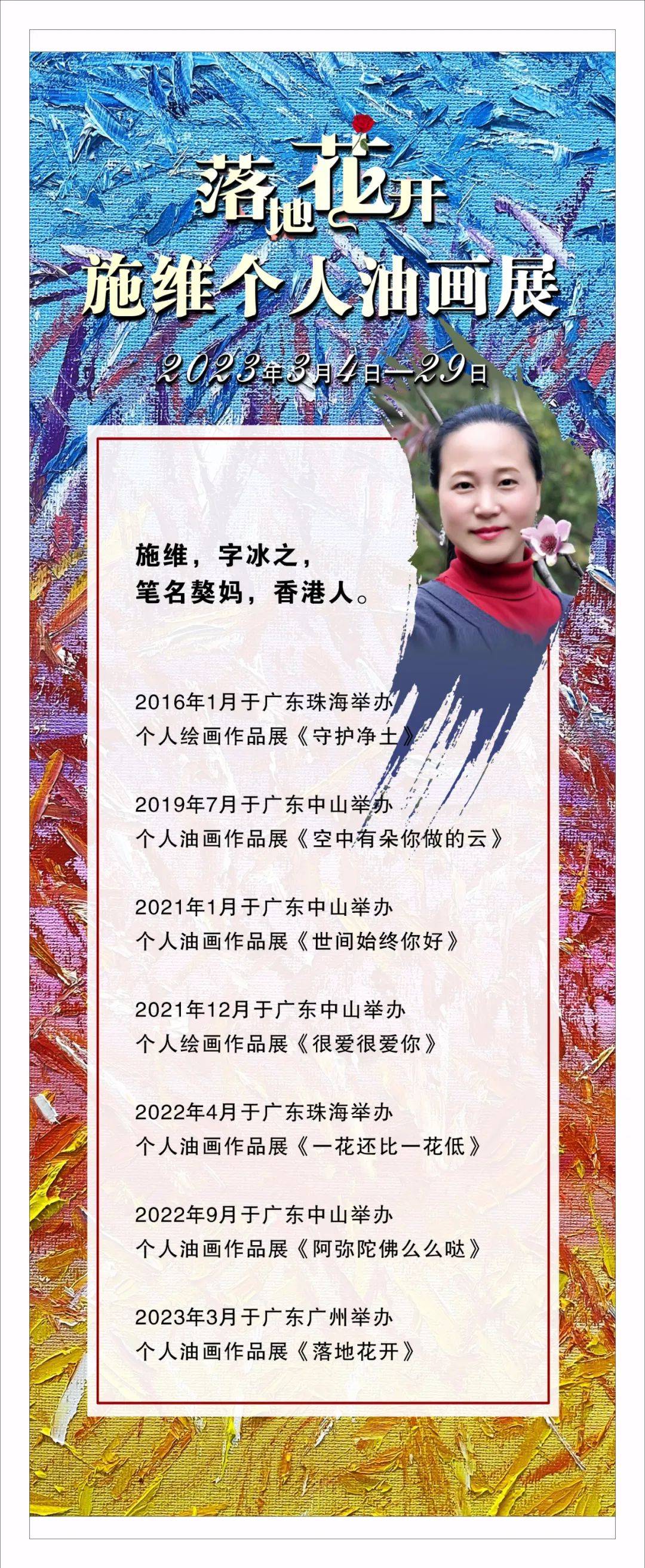 “落地花開·施維個人油畫展”由廣東飛晟投資有限公司、廣州市黃埔區傳統文化促進會主辦;由美迪藝術創意空間、浮詩繪文化藝術傳播中心協辦。畫展陳列時間:2023年3月4日—3月29日,為期25天,來自粵港澳大灣區近60位藝術家以及親朋好友參加了開幕儀式。