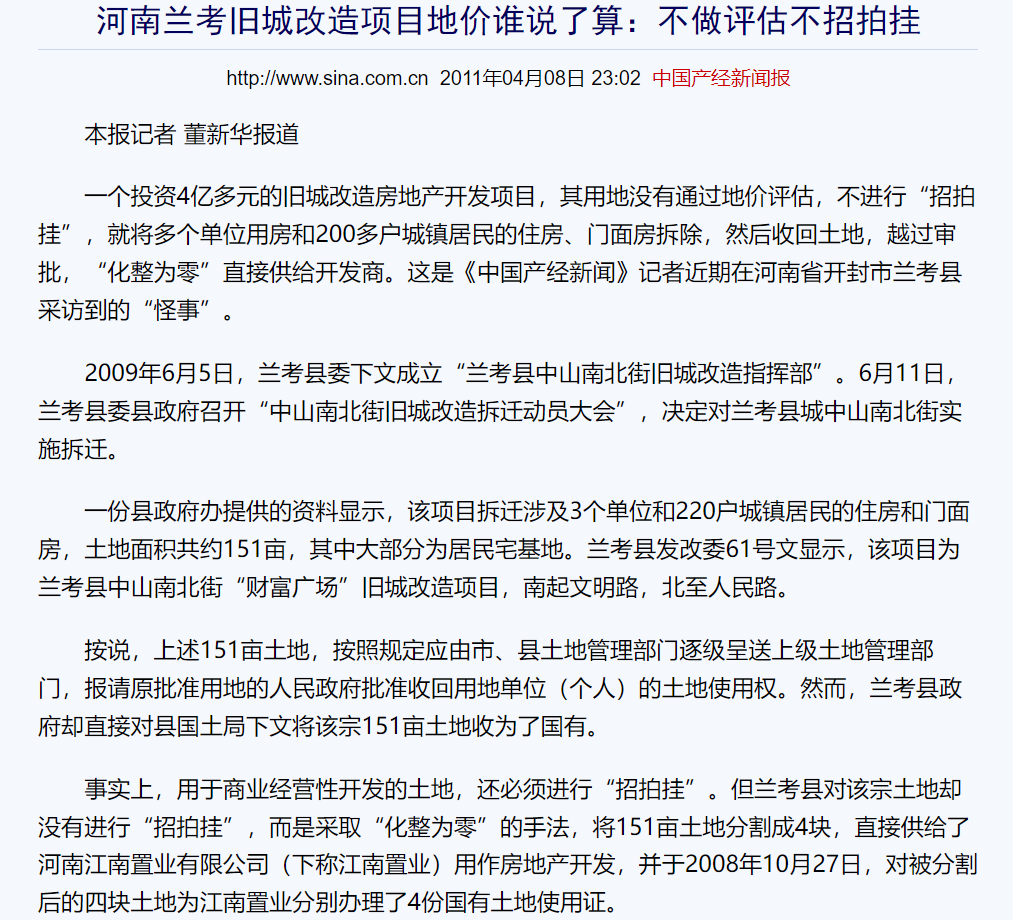 蘭考有一個財富廣場的舊城改造項目,那地塊一沒有按規定上報審批,二沒有履行“招、拍、掛”供地程序,就直接給出去了。
