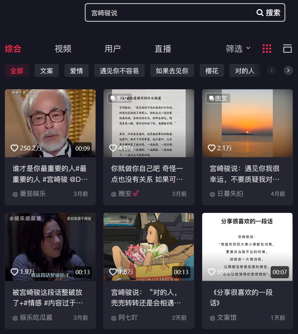 宮崎駿執導作品的混剪、解説,會配上一段關乎成長與情感的心靈雞湯,和宮崎駿的tag放在一起。甚至有專門的賬號,輸出“宮崎駿説”相關句子。