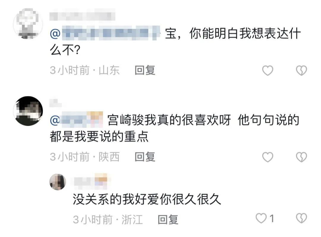 如果説,以上行為皆從側面展現了觀眾對作品的肯定,那麼在微博、抖音、小紅書、B站等平台輸入“宮崎駿説”,新世界的大門將為你敞開。網友們一字一句為宮崎駿本人疊加上八百層亞撒西濾鏡,讓人不禁懷疑“動畫大師”身份之外,他是否真的兼職着“情感大師”。