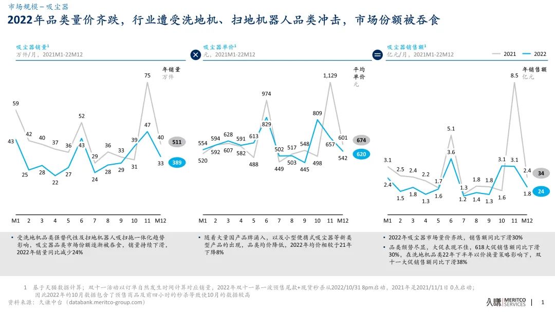 在懶人經濟和國貨崛起的時代大背景下,清潔電器賽道火熱,但受洗地機品類強替代及掃地機器人吸掃拖一體化趨勢影響,吸塵器品類市場份額逐漸被吞食,市場量價齊跌,整體規模持續下滑,2022年銷量同比減少24%(22年銷量389萬件 vs 21年銷量511萬件)