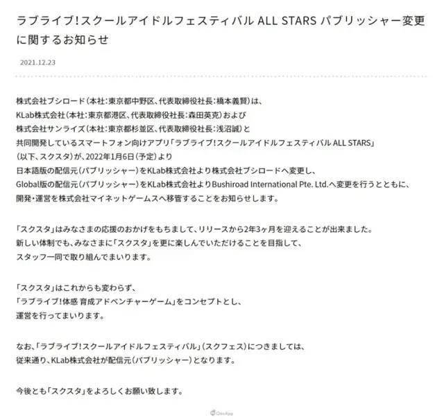 但如果一直觀察“LoveLive”企劃遊戲的朋友就會發現,Klab已經逐漸在“LoveLive”企劃中退場。2021年年底,Klab全面退出《Love Live! 學園偶像祭 All Stars》,發行全權轉移到Bushiroad上,開發運營權也交給了Mynet。