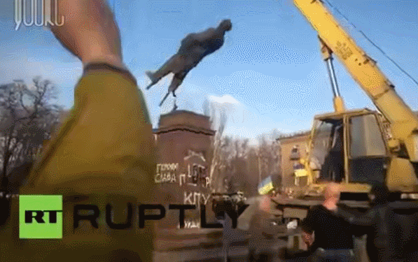 ▲俄媒報道烏克蘭拆除列寧雕像,下面被烏克蘭納粹分子噴上了萬字符