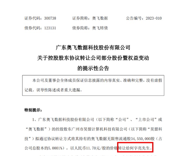 3月3日,廣東奧飛數據科技股份有限公司(簡稱“奧飛數據”,300738)發佈公告,公司擬通過協議轉讓方式將其持有的奧飛數據無限售流通股34,550,000股(佔公司總股本的5.0001%),以人民幣11.70元/股的價格轉讓給何宇亮先生。
