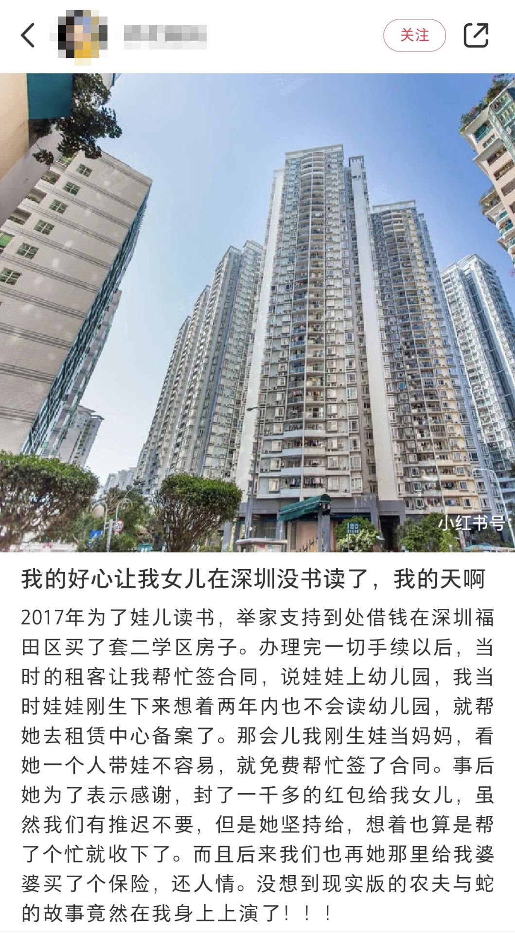 有一位媽媽在2017年的時候,為了孩子上學的問題,舉家到處借錢在深圳福田區買了套二學區房子。辦完手續之後,當時還住在房子裏的租客希望能和這位媽媽籤個合同,因為她的兒子要上幼兒園了了,她希望能繼續住在這裏直到把幼兒園上完。(據説是這位租客有個親戚在幼兒園當老師,只要這位媽媽出具一個租賃合同,孩子就可以繼續在這裏上幼兒園)