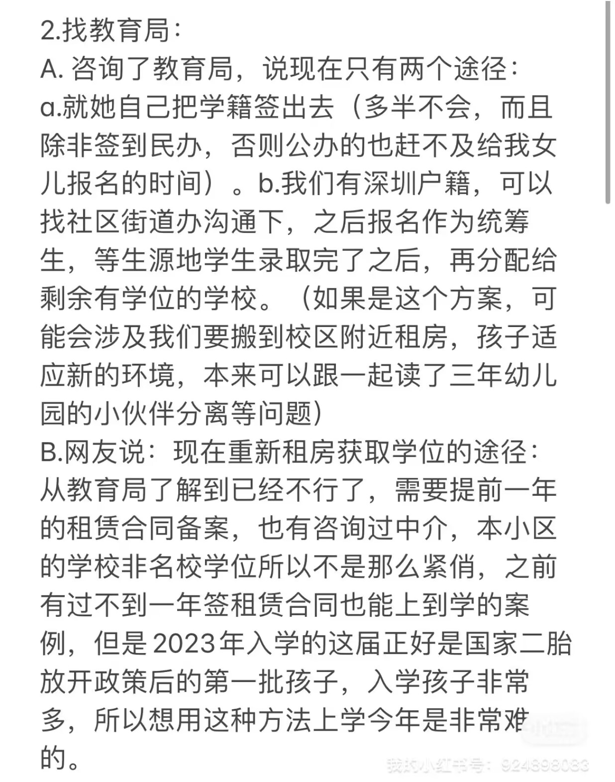 然後一家人又去找教育局,教育局的負責人表示只有兩種辦法,一種是讓這位租客自己將學籍簽出去(這不太可能),另外一種則是找社區街道辦溝通,之後報名作為統籌生,等生源地學生錄取完了,再分配剩餘有學位的學校。(理論上沒有問題,但是孩子可能要面臨和讀了3年幼兒園的小夥伴們分開的處境)