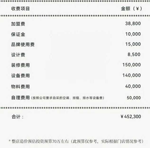 事實上,塔斯汀的加盟熱度近日一增再增。在社交媒體上,不乏諮詢塔斯汀加盟或分享加盟經驗的帖子。鋅刻度瞭解到,目前塔斯汀65㎡標準店的加盟費為38800元,但加上保證金、品牌使用費、設計費、裝修費、設備費用和物料費用等,合計費用為452300元,而整店造價預估投資預算為70萬左右。此外,“除了加盟費用,店長需要參與店長培訓,還要帶兩名夥伴參與店員培訓。”
