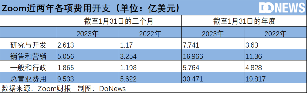 淨利潤暴跌的背後,免不了各項費用支出加大的關係。數據顯示,2023財年Zoom總營業費用為9.533億美元,與上一財年同期的5.622億美元相比,增長69.6%。